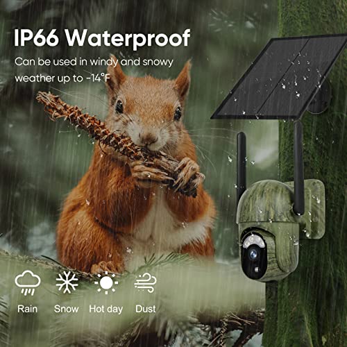 【360 Coverage, Day and Night】Capture detailed 2K resolution videos and images of wildlife with the help of infrared LEDs, ensuring clear visibility even in low-light conditions. This wildlife camera features a 355 pan, 100 tilt, and 4x digital zoom, providing full coverage. With its waterproof and camouflage design (IP65 rating), it can withstand outdoor conditions in the wilderness.