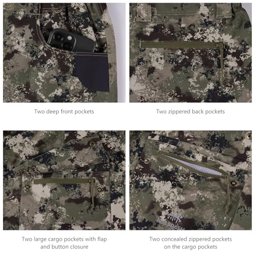 - Eight-pocket design to ensure you can access to your essentials conveniently and quietly: Two deep front pockets, two cargo pockets with flap and button closure, two concealed zippered pockets on the cargo pockets, and two mesh lined zippered back pockets that allow to vent heat for added breathability when you unzip them