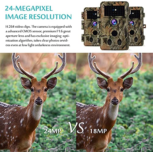 1. HD Photos or Videos and PIR function: the camouflage digital trail camera can be triggered by sudden change of ambient temperature caused by any movement of human or animals in a certain region of interested, which is detected by a high sensitive Passive Infra-Red (PIR) sensor (PIR up to 60° detection angle and night vision up to 90ft), and then captures pictures (highest to 32MP), or records HD video (2304×1296P) clips and save into SD card(support up to 512GB) automatically.