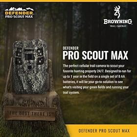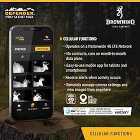 The Defender Wireless Pro Scout Max cellular trail camera from Browning is the perfect trail camera for scouting wildlife and monitoring your remote properties. The camera design allows it to operate for up to one year in the field on a single set of 8-AA batteries. It comes equipped with innovative RADIANT 6 Illumination Technology, Dual-Carrier Technology with either AT&T or Verizon service, GPS-tagged images, lightning-fast 0.25-second trigger speeds, and a remarkable 100-foot detection range. Throw in the camera’s ability to transmit HD images, adjust nighttime illumination with Illuma-Smart Technology, and the Multi-Shot and Rapid-Fire options, and users will soon see why Browning is “The Best There Is.” Camera Features: 20MP Built-in Chipset for Verizon or ATT Activation Pre-Installed ATT and Verizon SIM cards 120 ft. Infrared Illumination at Night RADIANT 6 Night Illumination Technology Adjustable IR Flash (Power Save, Fast Motion, Long Range) 0.25 Second Trigger Speed GPS Tagged Images 1600 x 900 HD+ Videos with Sound (5 sec.- 2 min. in Length) 100 Ft. Image Detection Range 0.35 Second Recovery Time Between Images Illuma-Smart Technology Automatically adjusts IR Flash for Perfect Night Photos SD Card Management Options Smart IR Video Up to 1 Year Battery Life from 8 AA batteries (Not Included) Up to 8 Multi Shot Images Up to 8 Rapid Fire Images Programmable Picture Delay (1 sec. – 60 min. Delays) Picture Info bar displays: Time, Date, Temperature, Moon Phase, Camera ID 12-Volt External Power Jack Supports up to 512GB SDXC Memory Card (Not Included) 1⁄4” -20 Tripod Socket Cellular Functions: Operates on a Nationwide 4G LTE Network (Verizon or ATT) Upload/email/text standard/HD images or video clips Create and Manage Footage in Folders Month-to-Month Data plans No Contracts Activate Cameras Only When You Need Them Easy-to-Use Mobile App for Tablets and Smartphones Scheduled or immediate image uploads