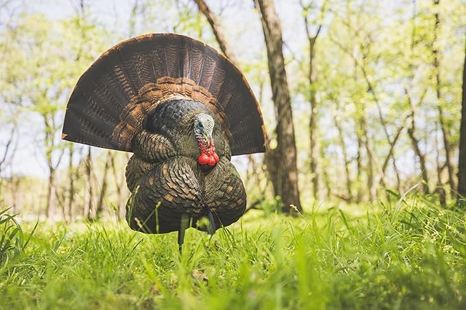 FLEXIBLE LIGHTWEIGHT CONSTRUCTION – Comes with a lightweight carbon stake that allows you to set this turkey decoy up in a fixed position or rotating freely Versatile design also accepts a real turkey fan (not included) for added realism