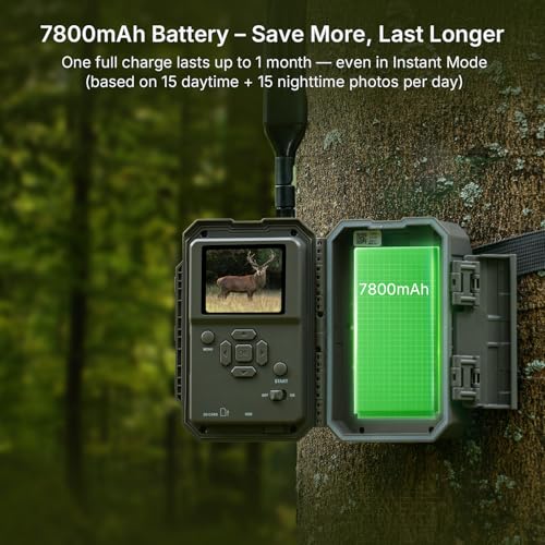 7800mAh Rechargeable Battery: Even with Instant mode, the high-capacity lithium battery supports up to 2 month of use (based on 15 daytime + 15 nighttime photos per day). For year-round worry-free operation, pair it with the GardePro SP350 or SP1000 solar panel (sold separately).