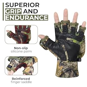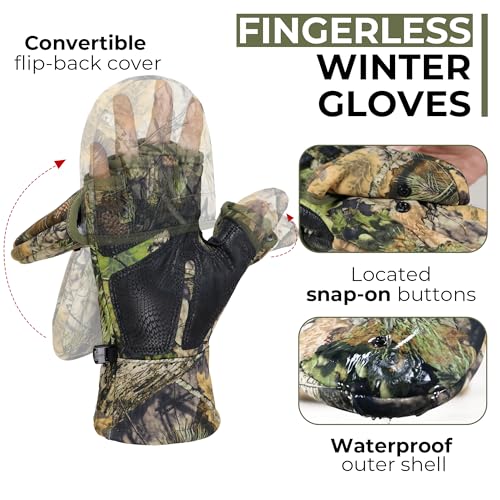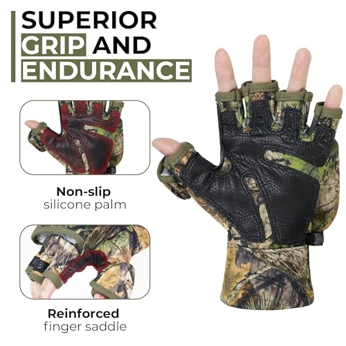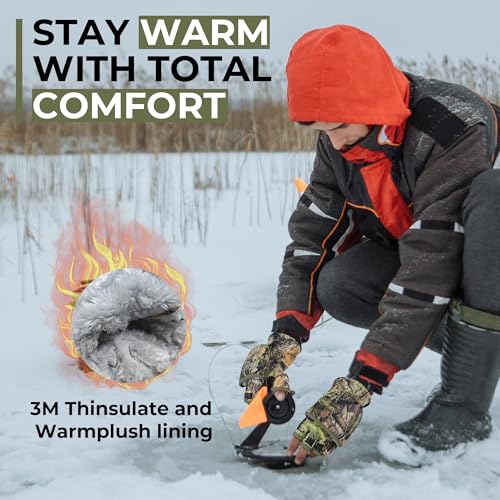 HANDLANDY Winter Fishing Gloves, 3M Thinsulate Camo Warm Flip Fingerless Convertible Mittens for Cold Weather, Hunting and Fly Fishing Gifts for Men Convert in a Snap: Flip back the cover to free fingers for tasks like tying knots, using phones, or handling tools. Snap buttons secure the cover. Stay Warm & Dry: 3M Thinsulate insulation and a plush lining provide warmth. The water-resistant, windproof shell blocks moisture and cold wind. Non-Slip Grip: Silicone palm offers a steady grip on fishing and hunting gear. Reinforced palm ensures durable performance. Secure Fit: Anti-lost buckle keeps gloves paired. Elastic wrist closure seals out wind for added warmth. The Go-To Gift: Ideal for fishing, hunting, photography, and winter activities. A practical gift for Christmas, Father’s Day, Thanksgiving, or birthdays.