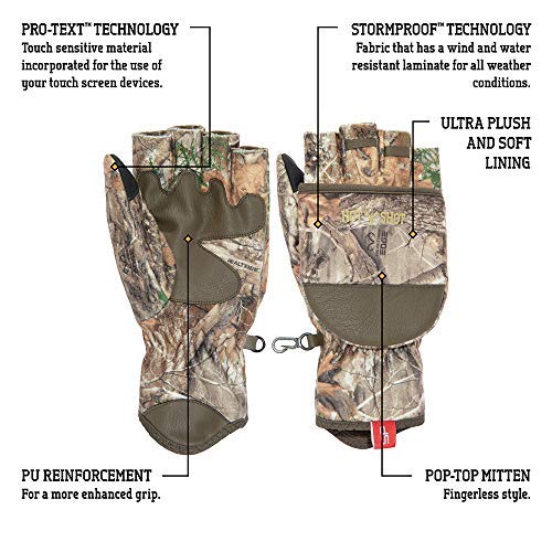 The Men’s Cyclone Pop-Top Mittens by Hot Shot is great for the outdoors with Realtree Edge camo and functional design with spandex and microfiber fleece blend. Keep your hands warm and ready for the hunting environment with the gloves stormproof capabilities for cold weather. The design includes a touch silicone print on index finger and thumb and laminated TPU with monkey fleece backing.