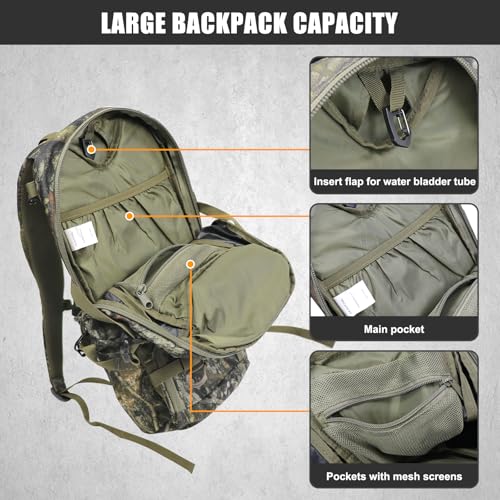 LARGE CAPACITY: Large front pocket and main compartment offer plenty of space for storing and organizing gear. This backpack offers a 1200 cubic inches (18 L) capacity. The size of the hunting backpack is 20″*10″*6″