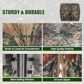 【UPGRADED FULL OPEN DOOR】HUNTSEN hunting blind’s door opens fully to 210 degrees, easier and more convenient to entry and exit. And it features slient- sliding windows on each side, ensuring hunters remain undetected.The inside of hunting blinds ground is also equipped with storage pouches for storing hunting equipment/tools.