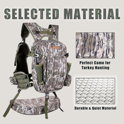 COMFORTABLE & FUNCTIONAL: The turkey hunting vest comes with a removable and adjustable 3-inch cushioned seat with a magnetic interface that provides extra comfort when sitting. The padded back with breathable mesh and ergonomic design offers a comfortable hunting experience. The hunting vest is made of brushed cloth and noise reduction fabric, ensuring durability and silence during the hunt.
