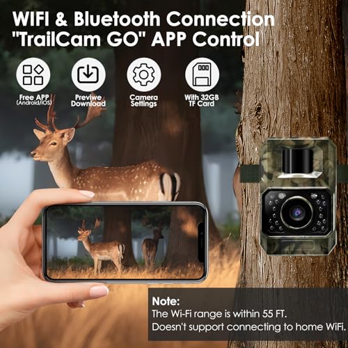 Wi-Fi Bluetooth Connection: No Screen Trail Camera is compatible with ultra-low power Wi-Fi and Bluetooth technology and comes with a free and easy-to-use APP(TrailCam GO). (Note: The distance between the phone and the camera is limited to 55ft) (about 15 meters), and cannot be blocked by anything. There is no prompt function.