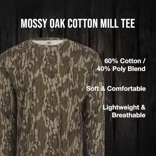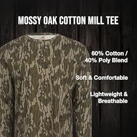 - SOFT & BREATHABLE COMFORT: Crafted from a premium 60% cotton / 40% polyester blend, this Mossy Oak Shirt delivers unbeatable softness and breathability. Available in authentic camo patterns, Bottomland, Original Bottomland, and Greenleaf. This quick-drying men’s camo shirt keeps you cool and concealed whether you’re on a turkey hunt or hiking the backcountry.