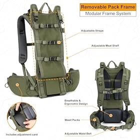 Massive, expandable capacity + meat-haul ready – Frame pack capacity: 2400 cubic inches; an adjustable meat shelf which expands an extra 2,500 cubic inches of storage between the frame and bag for hauling meat or gear, and supports about 150 lbs.