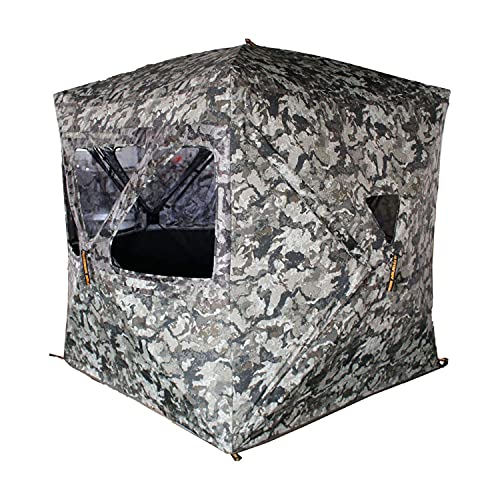 CONSTRUCTION – Black Backed, Water Resistant Heavy-Duty 600 Denier Fabric in Camo for a natural looking environment. The heavy duty construction with help it last and the silent window system will allow for limited noise output