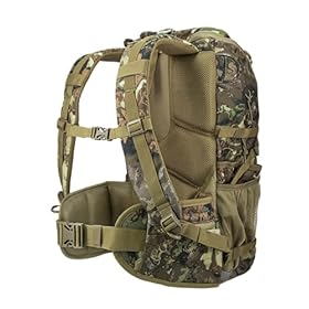 This pack comes with a brown rain cover for weather protection and a zipperless lid design for quiet access to your gear. The large main compartment offers ample storage, while an interior mesh pocket helps keep your gear organized. Two fabric and mesh side pockets provide additional storage options, and the two-piece adjustable, removable waist belt ensures a comfortable fit. It also features two waist belt pockets with silent zippers for easy access to essentials. Dual accessory side straps allow you to securely carry gear and weapons. The flip-down lid with pockets provides convenient access when you’re in the stand or blind. With chest and waist straps for added support, this pack is made from 100% poly brush, offering a soft, durable, and quiet material perfect for outdoor use.