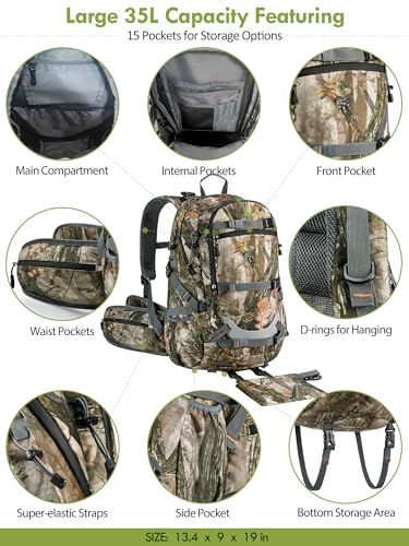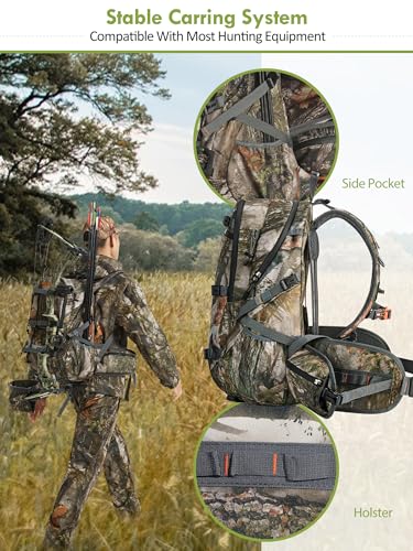 Large Capacity Backpack With 15 Pockets – The large main compartment, well-organized compartments and pockets, and expandable side pockets create a comprehensive storage system. The water resistant 600D nylon material is durable and resistant to wear, while the sturdy buckles securely protect your hunting accessories. Hunting pack also features various external straps, D-rings, and elastic cords to enhance storage versatility