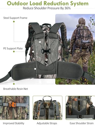 Load-Reducing System – A 4-in-1 ergonomic load reduction design that effectively reduces the load and fatigue during hunting trips. The PE board distributes the backpack weight, the steel frame reduces pressure on the back, the resin mesh promotes heat dissipation, and the adjustable shoulder straps and padded waistband distribute weight to the waist and hips, relieving shoulder pressure. Enjoy deer or duck hunting